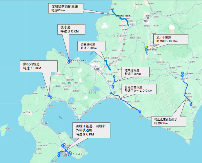 では、北海道(道南、道央)の無料で走れる高速道路の全体像として制限速度の記載付きで全体像を記載します。地図が少しBUSYで見にくい部分がありますが、後ほど各道路のまとめ表を記載しますので、大枠の把握に使用してください。