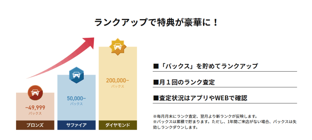 会員ランクはバックスと呼ばれるオートバックスのポイントによって決まります。(1回/月の判定内容更新)