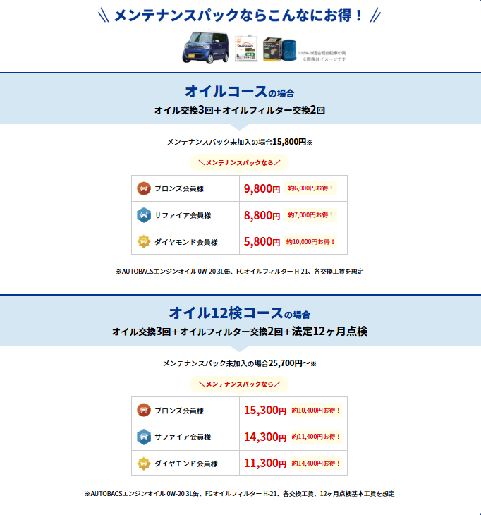 オートバックスのメンテナンスパックのページには以下画像のようにオイル+フィルター交換のみで2年の場合ブロンズ会員9800円、サファイア会員8800円、ダイヤモンド会員5800円と書いてありますがこれは軽自動車の場合の料金例なので注意してください。