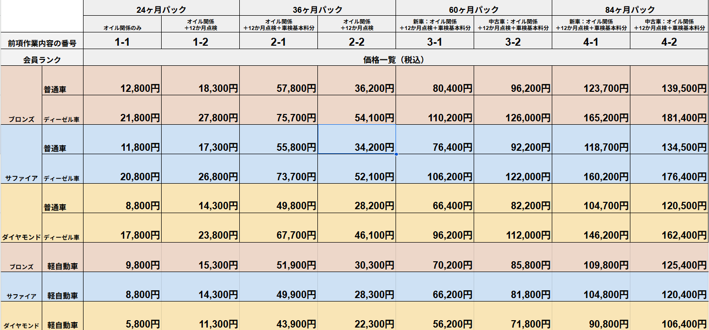 期間と内容は以下4つに区分されます。エンジンオイル系統とはエンジンオイル+オイルフィルター交換のことです。以下リスト記載の1-1とかの番号は後で出てくる価格表と対応しています。